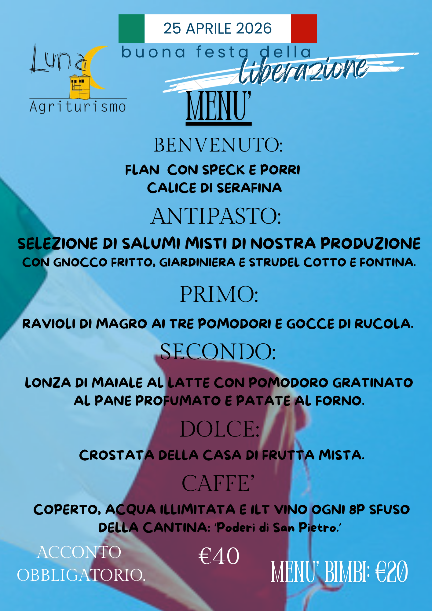 25 APRILE Agriturismo Luna2026-04-02T17:16:29+02:00 Ti piace? Condividi sui Social! FacebookXWhatsAppEmail Post correlati PASQUETTA IN AGRITURISMO PASQUETTA IN AGRITURISMO MENU’ BIMBO PASQUA & PASQUETTA MENU’ BIMBO PASQUA & PASQUETTA PASQUA IN AGRITURISMO PASQUA IN AGRITURISMO